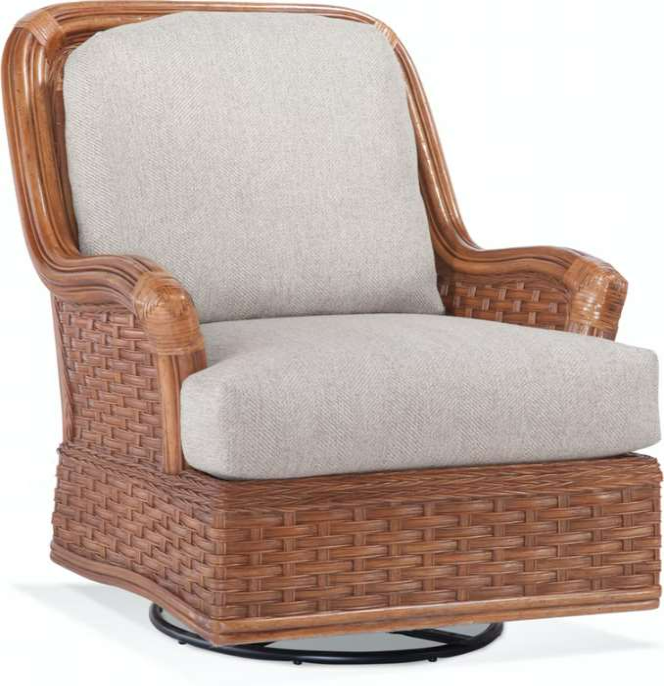 Accentuate your living room or four seasoned porches with the relaxed tropical style of this swivel glider chair. Woven detail is framed in a light exposed wood with a reed design, while plump seat and seat back cushions provide comfort. The inviting character continues with a soothing swivel gliding motion.Read More