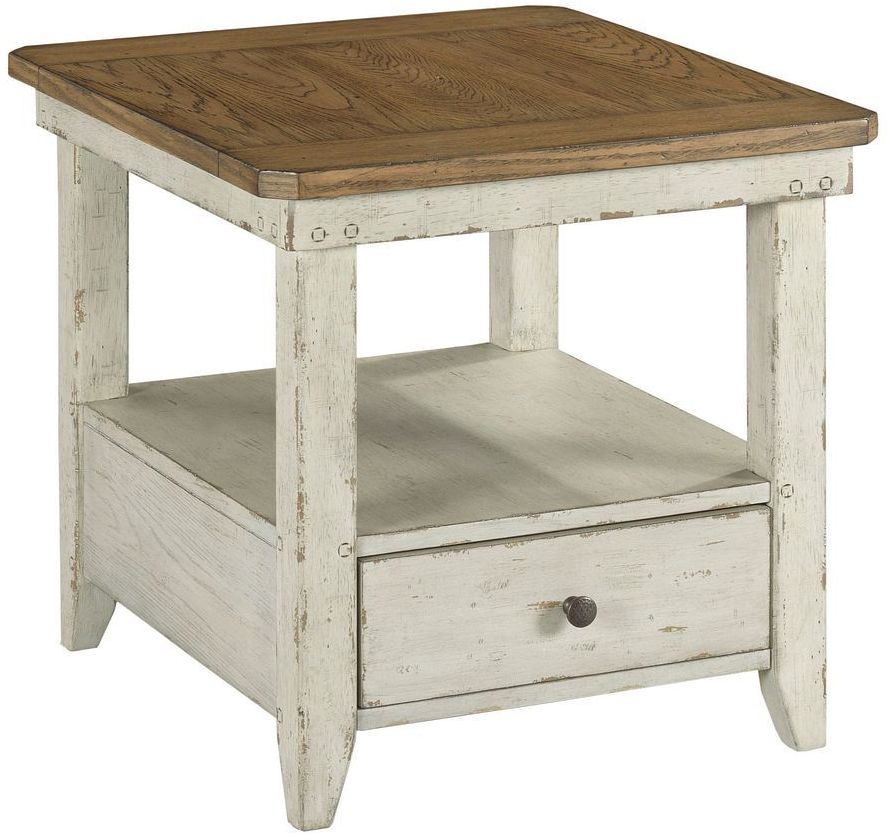 Crafted of White Oak Veneers in a chalk white finish and medium brown finish with warm undertones. The distressed farmhouse style has exposed joinery, two rustic finishes, and functionality. Features primitive design elements including generous proportions, and square peg in round hole exposed joinery.Read More