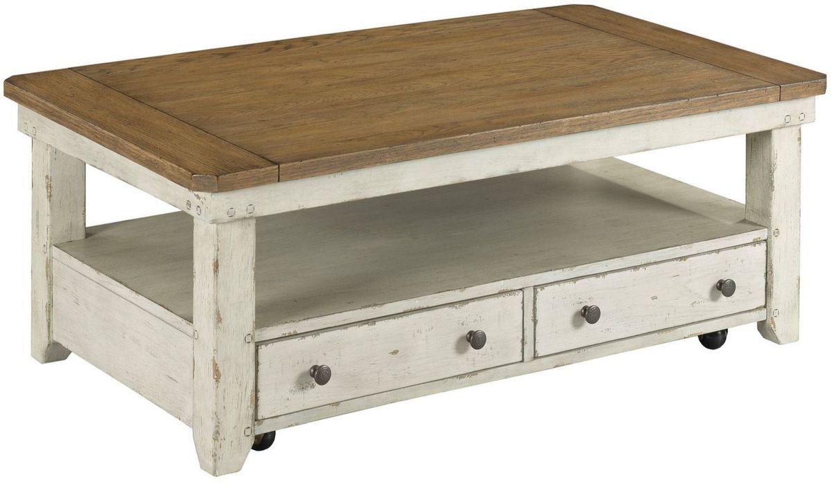 Crafted of White Oak Veneers in a chalk white finish and medium brown finish with warm undertones. The distressed farmhouse style has exposed joinery, two rustic finishes, and functionality. Features primitive design elements including generous proportions, and square peg in round hole exposed joinery.Read More