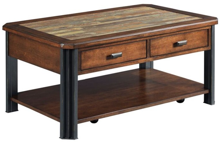 This cocktail table is designed with rustic, industrial and contemporary element making it very popular in todays homes. It is constructed of birch veneers with a slate top and metal legs. It comes equipped with two drawers, one shelf, and casters for easy mobility.Read More