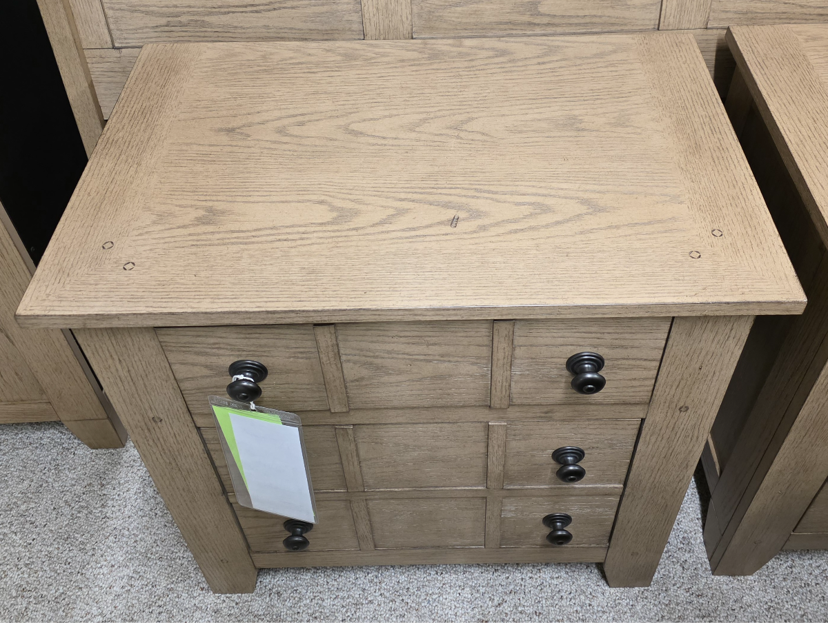 AS IS, DISCONTINUED. Staple any room with this rustic American style night stand. Constructed with select hardwoods and ash and oak veneers, this piece features an aged oak finish, complete dust proofing and antique brass knob hardware. With wood and peg accents, this night stand is sure to bring uniqueness and functionality to any room.Read More