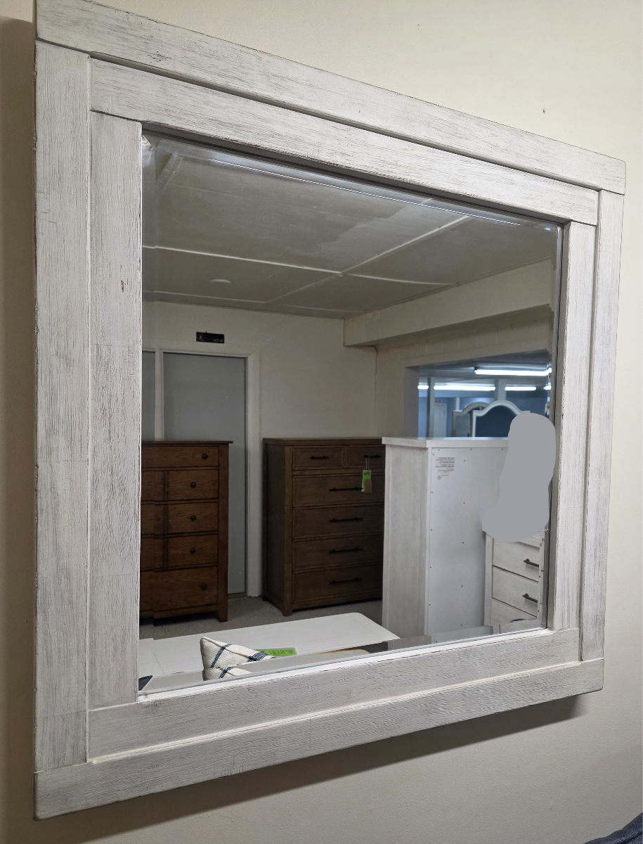 AS IS, DISCONTINUED. Complete your farmhouse look with this square mirror. The flea market white finish features heavy distressing that is accented by the high/low veneer pattern that encompasses the beveled mirror. This mirror is more than a piece of furniture, it is a statement piece.Read More