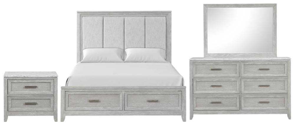The Fiona 4-Piece Bedroom Set includes a king-sized bed, dresser, mirror, and nightstand. With its elegant mist gray finish and modern design, this set creates a stylish and cohesive look. The spacious king bed ensures ample comfort, while the dresser and nightstand provide practical storage solutions.Read More