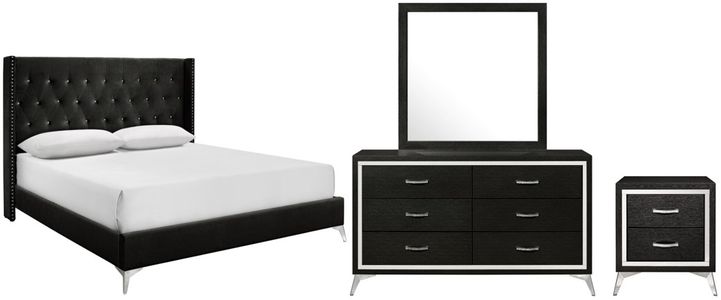 The Huxley bedroom set in black is a marvel of contemporary glam and durable construction. This set includes bed, nightstand, dresser and mirror, all crafted from manufactured woods and eco-friendly decorative laminate for long-lasting use.Read More