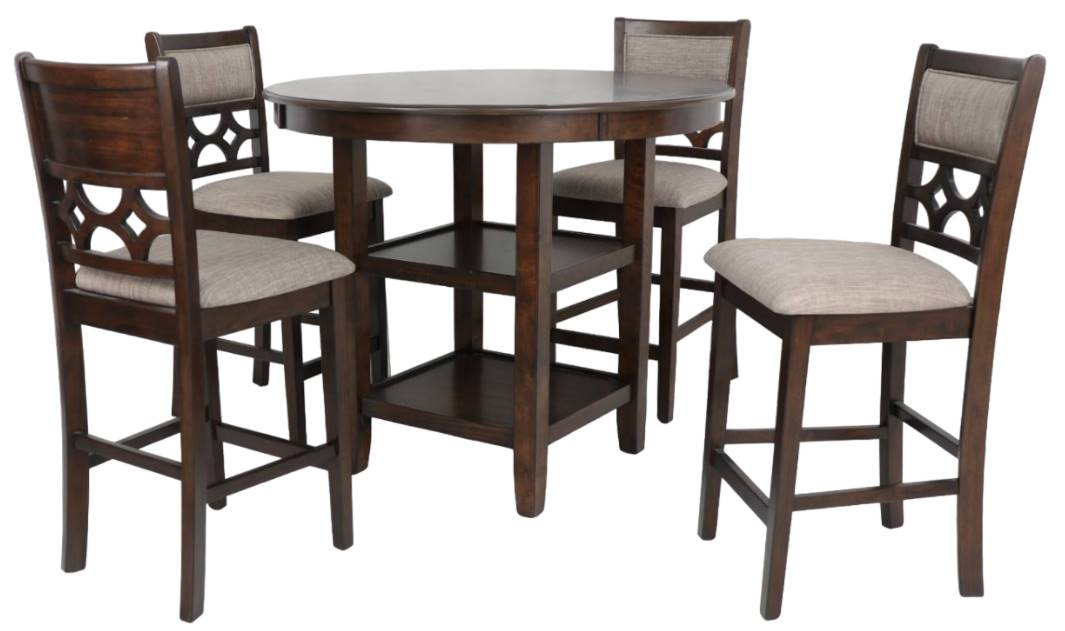 The counter height 42" round dining table has 2 handy storage shelves under the top and is the perfect spot for family dinners and game nights