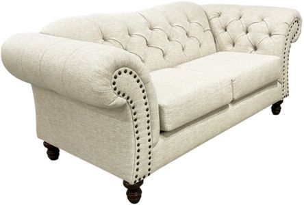 Cozy-Easy Care Fabric: 100% Polyester natural woven upholstery is carefully tailored and complemented by gracefully shaped backs, button tufting and nailhead trim