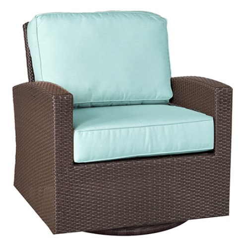 Outdoor swivel glider with the incredibly modern and deep-seated Cabo Wicker Collection. The UV-protected, wicker offers a flat woven design, creating a contemporary look with clean lines. This piece includes fade- and mildew-resistant Sunbrella® cushions, available in a wide selection of colors.Read More