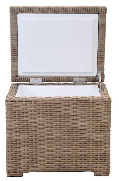 The Universal End Table Ice Chest adds versatility to any outdoor space. This unique accessory features wicker finishes that are made from High-Density Polyethylene (HDPE) and infused with rich color and UV inhibitors to prevent cracking, chipping and fading ordinarily caused by sunlight.Read More