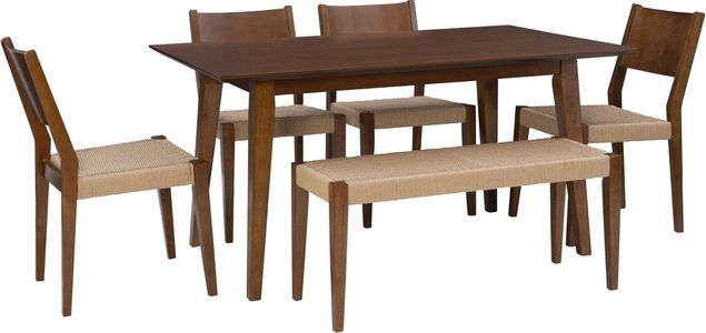 Table boasts a rubberwood veneer and solid wood chairs are stained in warm brown tones