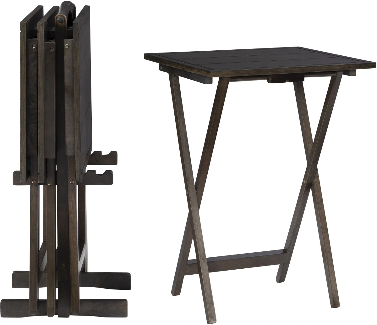 With stylish plank-style tops and a gray wash-stained finish, the four folding tray tables in this set are great for use every day or to entertain. The matching stand neatly stores the trays and has a handle for portability.Read More