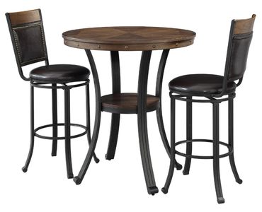 Perfect for cozy corners, casual dining, or stylish entertaining, this 3-piece faux leatherb set delivers bold design in a compact footprint. The 36” round table features an umber brown or gray wash finish stained top crafted from wood veneer, accented with antique brass nailhead trim and supported by a sleek black or pewter powder-coated steel frame.Read More