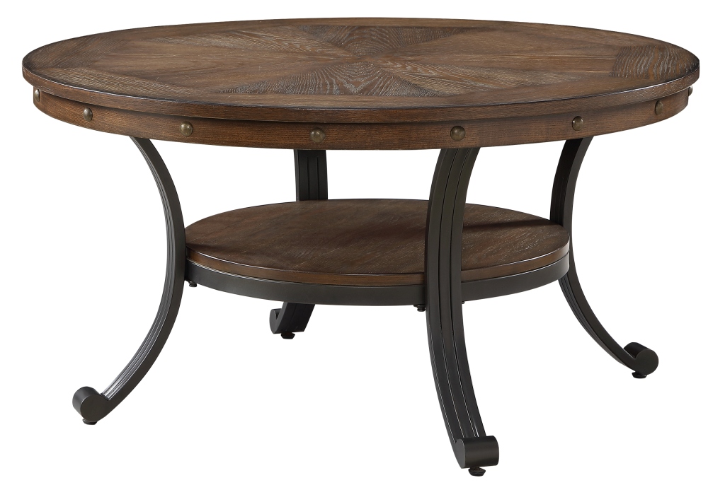 Create an engaging sitting area gathered around the stylish profile of the Cocktail Table. This lovely design features a round tabletop with a wedge design created in oak woodgrain veneer in a rustic umber finish that’s warm and engaging. Antique brass finish nailheads dot the coffee table apron.Read More