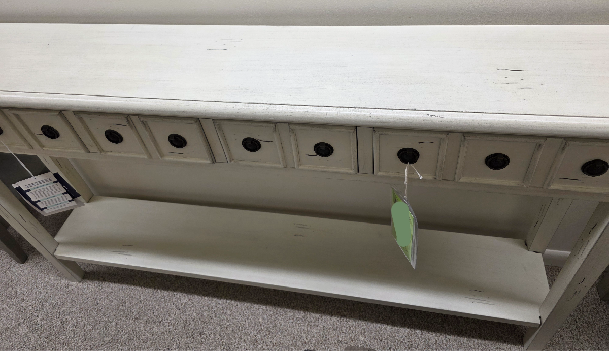 AS IS, CLOSEOUT. Designed with smaller spaces in mind, this slim line console serves as a stylish accent in your foyer or living room. The slender silhouette is equipped with four drawers to easily store small essentials, while a bottom shelf is perfectly sized to show off your favorite books or greenery.Read More