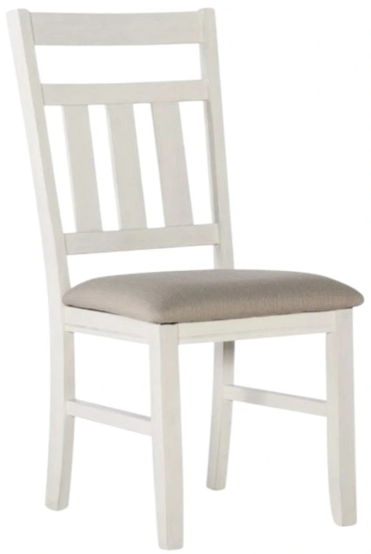 The Turino side chair blends charm and functional comfort. Its slatted back rests on a distressed whitewashed rubberwood frame, paired with a cushioned beige performance-fabric seat that resists stains and is easy to clean.Read More
