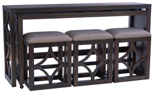Set includes stationary console, smaller rolling console, and three matching stools