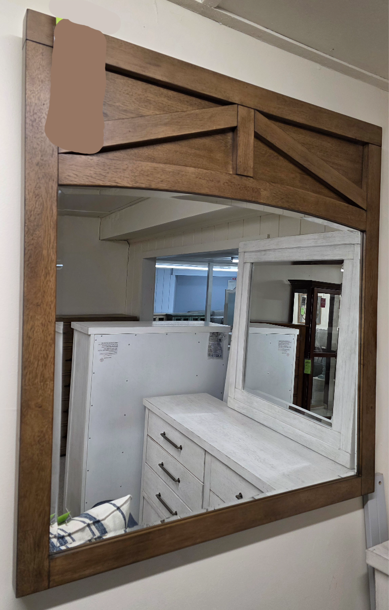 AS IS, DISCONTINUED. Finished in toasted almond, the dresser's warm and inviting hue captures the essence of aged wood, adding a touch of natural beauty to your bedroom decor. Its textured surface and nuanced tones infuse a sense of character and depth, creating a focal point that draws the eye.Read More