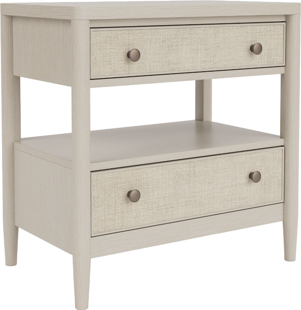 Constructed of select hardwoods and oak veneer. Individually framed drawers. Woven natural material on drawer fronts. Multistep blonde finish for a casual vibe. Sleek full round tapered legs.Read More