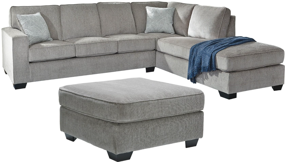 Includes 2-piece sectional (with right-arm facing corner chaise and left-arm facing sofa) and ottoman