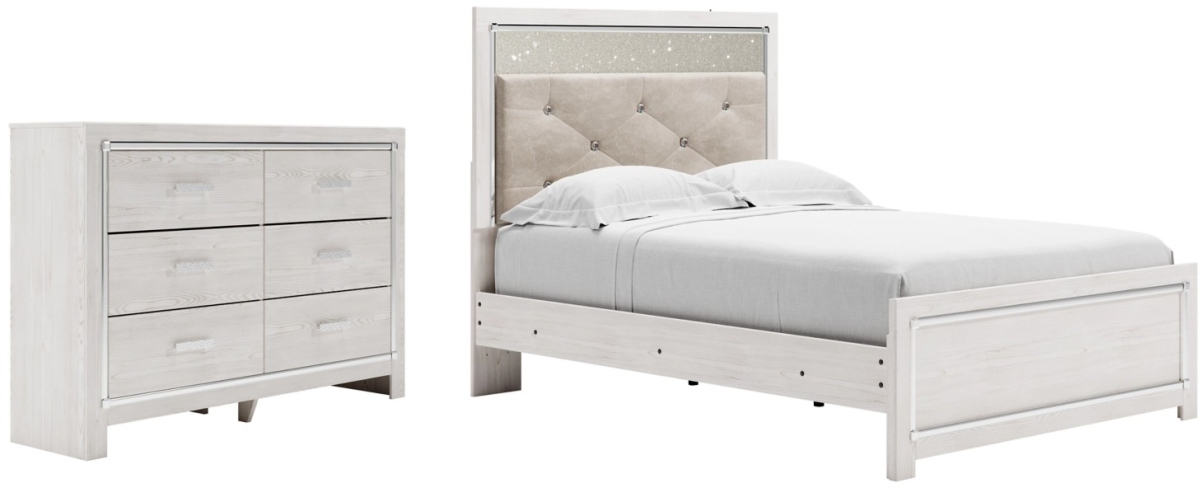 The epitome of fashion-forward design, this bedroom package is a beautiful blend of comfort and luxury. The panel bed and dresser feature shiny chrome-tone accents and a pearlized finish, while button-tufted upholstery brings a glam touch to the bed's richly rustic appearance. The dresser provides plenty of storage space for your wardrobe needs, and the bed’s remote-controlled LED lighting adds style and modern conveniences to your restful retreat.Read More