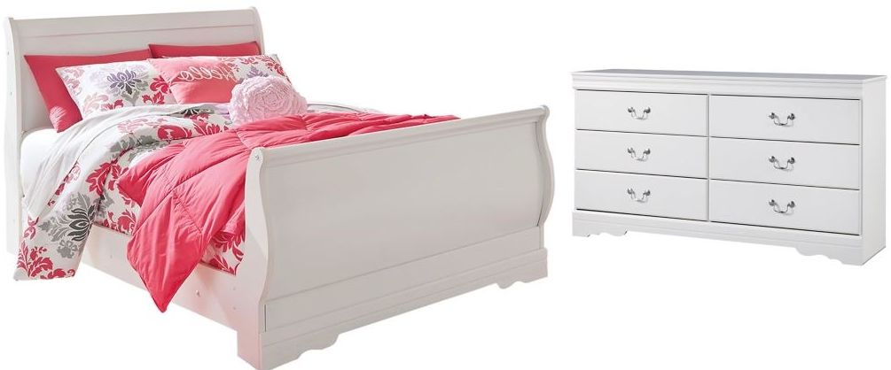 Includes sleigh bed (with headboard, footboard and rails) and dresser