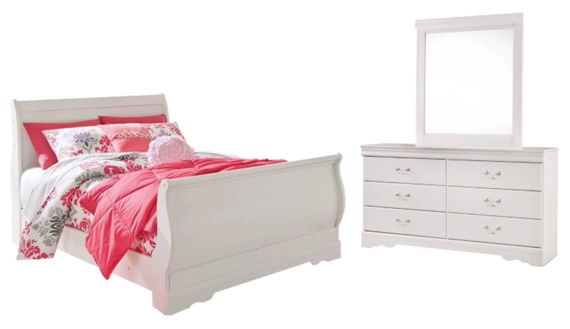 Includes sleigh bed (with headboard, footboard and rails), dresser and mirror