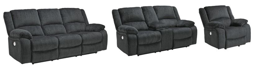 Includes reclining power sofa, reclining power loveseat with console and power rocker recliner