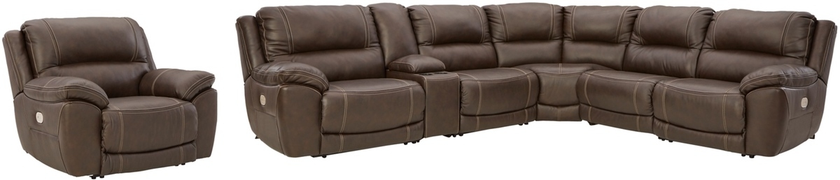 Load up on comfort in a cool, clean-lined and contemporary way with this 6-piece power reclining sectional and power recliner package in a delicious shade of chocolate brown. Rest assured, you'll enjoy the feel of real leather everywhere your body touches (real leather interior seating/matching faux leather exterior).Read More