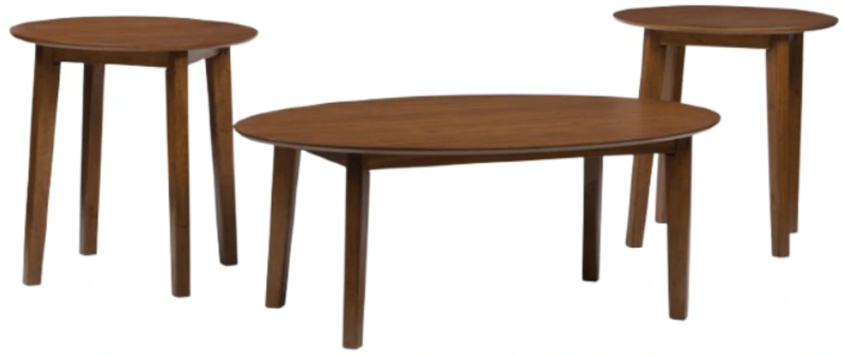 Stylish simplicity teams up with mod flair to define this table set. A versatile and inviting brown wood-tone finish on the coffee table and end tables enhances the stunning wood grain character. Rounded tops polish off the design with a dash of mid-century appeal.Read More