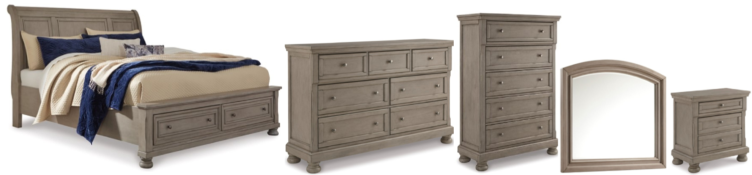 Includes queen sleigh bed (headboard, footboard with storage, rails with roll slats), dresser with mirror, chest of drawers and 1 nightstand