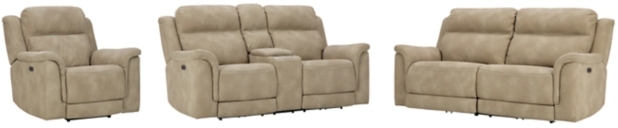 Includes adjustable headrest power reclining sofa, adjustable headrest power reclining loveseat with console, and adjustable headrest power recliner