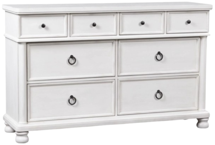 This artfully crafted dresser combines classic elements with a clean modern approach. Its rubbed antiqued white finish exudes a comfy, timeless appeal that's sure to carry you away to a dreamy time and place. Simple round metal knobs and ring pulls on the dresser's spacious drawers make just the right statement.Read More