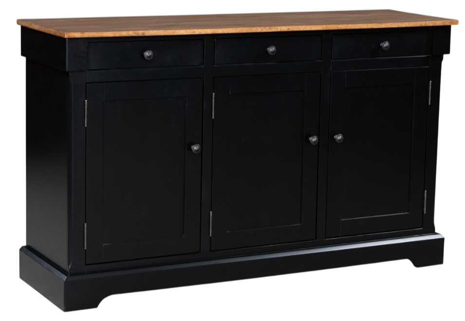 Raise the bar on modern farmhouse style with this dining buffet. Its good looks are accentuated with a two-tone finish and a casual butcher block veneer top. The sturdy silhouette adds a hearty element, whether your style is vintage, country or eclectic. Three drawers and three cabinets with adjustable shelves serve your entertaining needs well.Read More